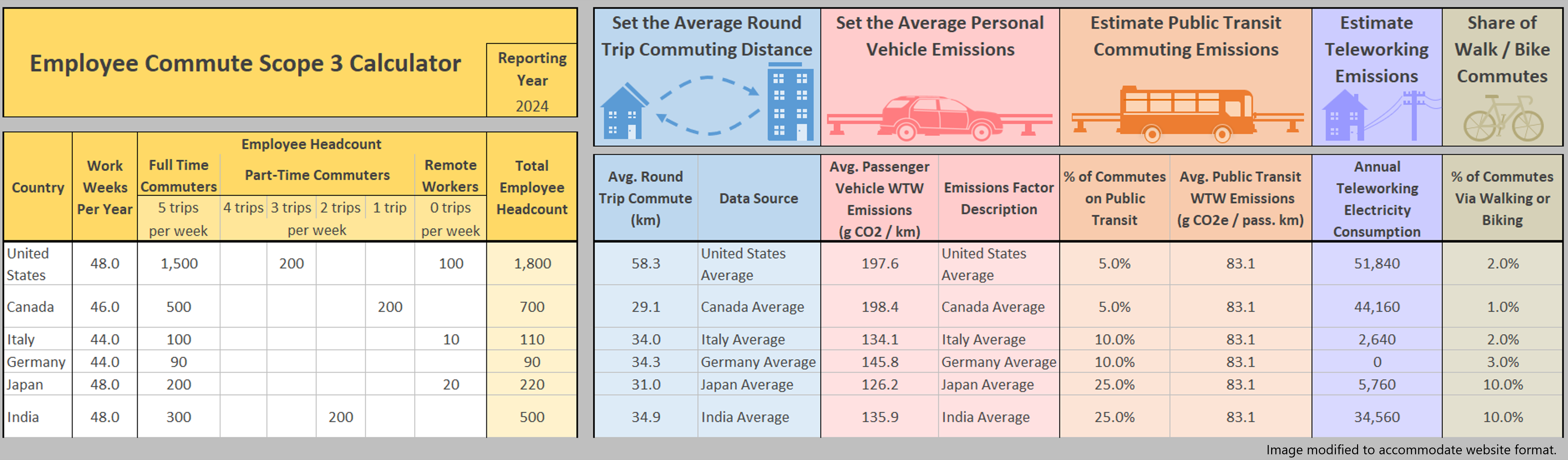 • The employee commuting calculations will require your organization’s employee headcount, by country, and broken down by the typical weekly commuting schedule for each employee (e.g., 5 days per week, 3 days per week, remote worker, etc.).