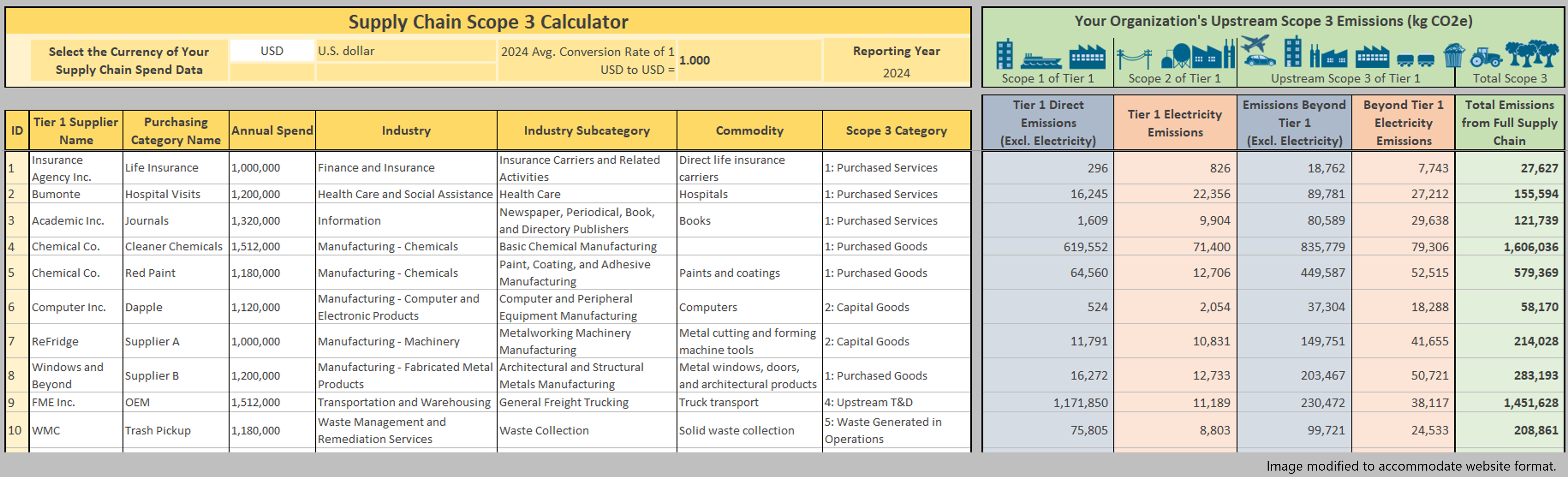 • The supply chain emissions calculations will require your organization’s supply chain spend (i.e., spend with Tier 1 suppliers) broken down by purchase description and/or supplier, which will then allow you to select the Environmentally-Extended Input-Output emissions factors that are most applicable to each purchase.