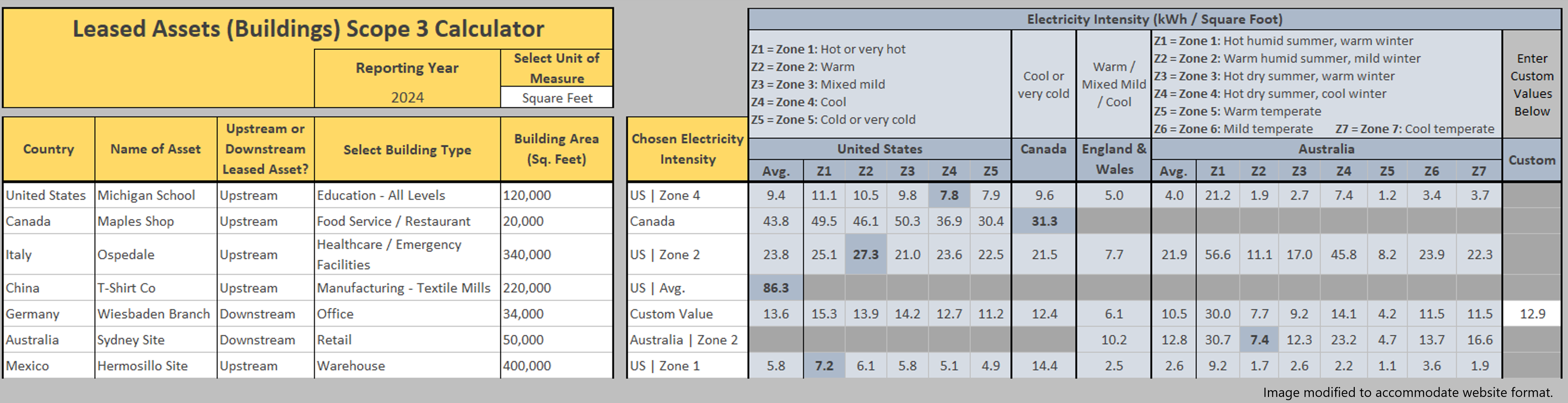 If your organization operates leased assets or franchises, the most common source of emissions in those Scope 3 categories are related to energy consumption in buildings. The GZA Calculator allows users to easily evaluate those emissions by providing a wide range of building energy intensity values for multiple countries, climate zones, and building types. Simply provide the building size, location, and type (e.g., office, warehouse, retail, etc.) to receive automated energy consumption and Scope 3 emissions results.