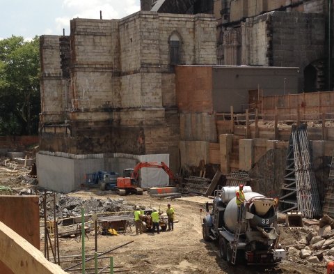 GZA’s instrumentation program included automated crack gauges, tiltmeters, survey monitoring points, and seismographs. During the eight-month program, GZA continuously monitored and reported data to multiple stakeholders, alerting them to exceedances. GZA consulted with the cathedral’s structural engineer, contractor, and the developer of the new structure regarding the crack and vibration criteria appropriate for the adjacent construction and safety of the cathedral. Access for installation was carefully scheduled around ongoing operations to minimize disruption, and all monitoring was done remotely, rather than collected manually. The program was custom-designed to place instruments as discreetly as possible so as not to intrude on the worship spaces, and innovative methods of sensor attachment were developed to protect the cathedral’s stone, granite, and limestone materials.